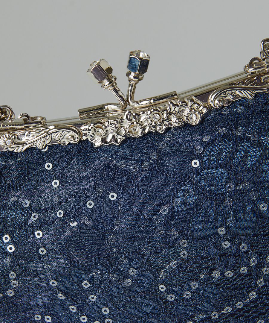 Elegantná modrá kabelka s čipkou a lesklými flitrami dokonale ladí s topánkami, ktoré nájdete tiež v našej ponuke.