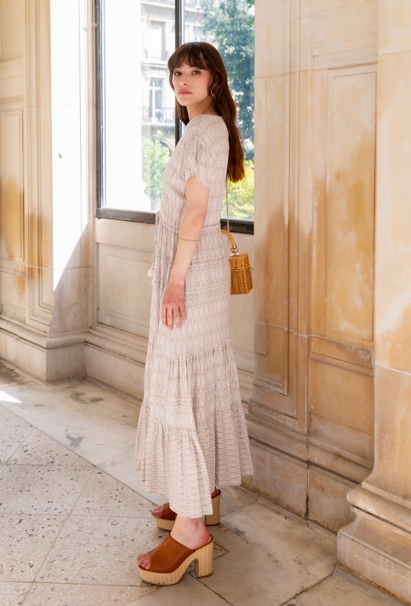 Univerzálne maxi šaty z viskózovej tkaniny s výstrihom v tvare V a zapínaním na gombíky vo vrchnej časti. Ležerný strih so zaväzovaním v páse , krátke rukávy , originálna potlač, nepodšité. Ich kvalitný padavý materiál je vhodný na celodenné nosenie a svojou vzdušnosťou vás nesklame ani pri premenlivom počasí.