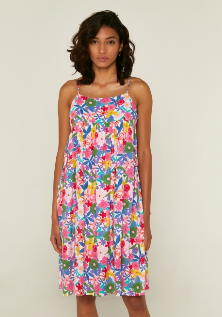 Mini šaty s viacfarebnou kvetinovou potlačou sú tou pravou voľbou na leto. Štvorcový výstrih, ramienka, priliehavé pod prsia s naberanými detailmi, bočné vrecká, vnútorná podšívka. Modelka nosí veľkosť S.