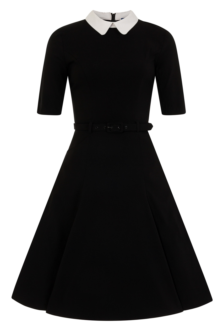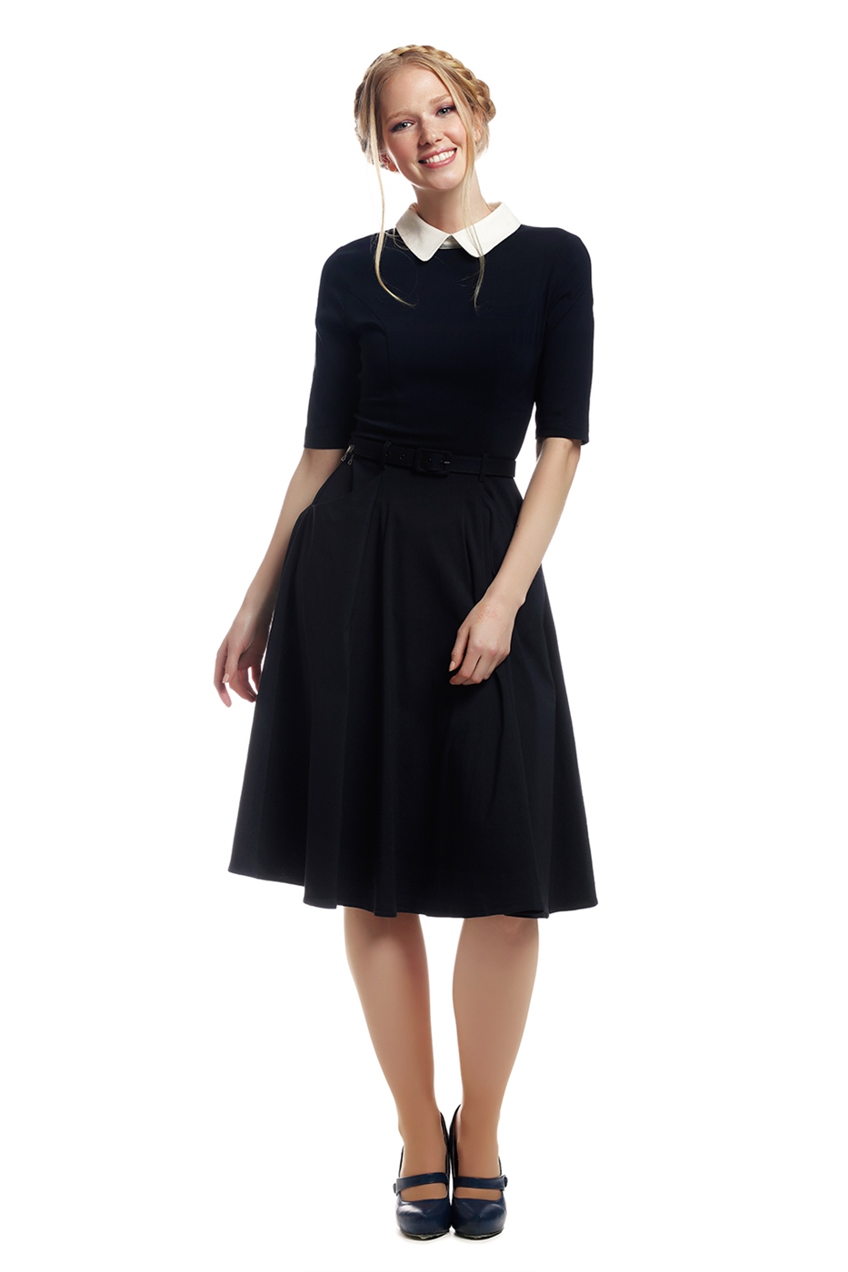 Winona Čierne šaty s golierikom sú výnimočnou voľbou na novú sezónu.Elegantný biely golier kontrastuje s čiernymi šatami v pohodovej dokonalosti. Rozšírená sukňa so zaoblenými prednými vreckami, rukávy v dĺžke po lakte, zapínanie na stredový zadný zips, pohodlný strečový materiál. Skombinujte so skvelým kardigánom a podpätkami !
