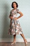 Kvetinové midi šaty Varvara-Sadie sú skutočne krásne a majstrovské dielo ľahkých swingových šiat. Krátke rukávy s prehnutými manžetami, srdiečkový výstrih, rukávy sú krátke a jemne obopínajú vaše ruky s dostatočným priestorom aby ťa osviežil večerný vánok, áčková sukňa, vytvára ten najkrajší tvar! Vyrobené z ľahkej polyesterovo-elastenovej látky v elegantnej pieskovej farbe s kvetinovou potlačou v bielej, zelenej a ružovej farbe Zapína sa na zips na boku a má vrecká! Dodáva sa s odnímateľným opaskom z rovnakej kvetinovej látky.